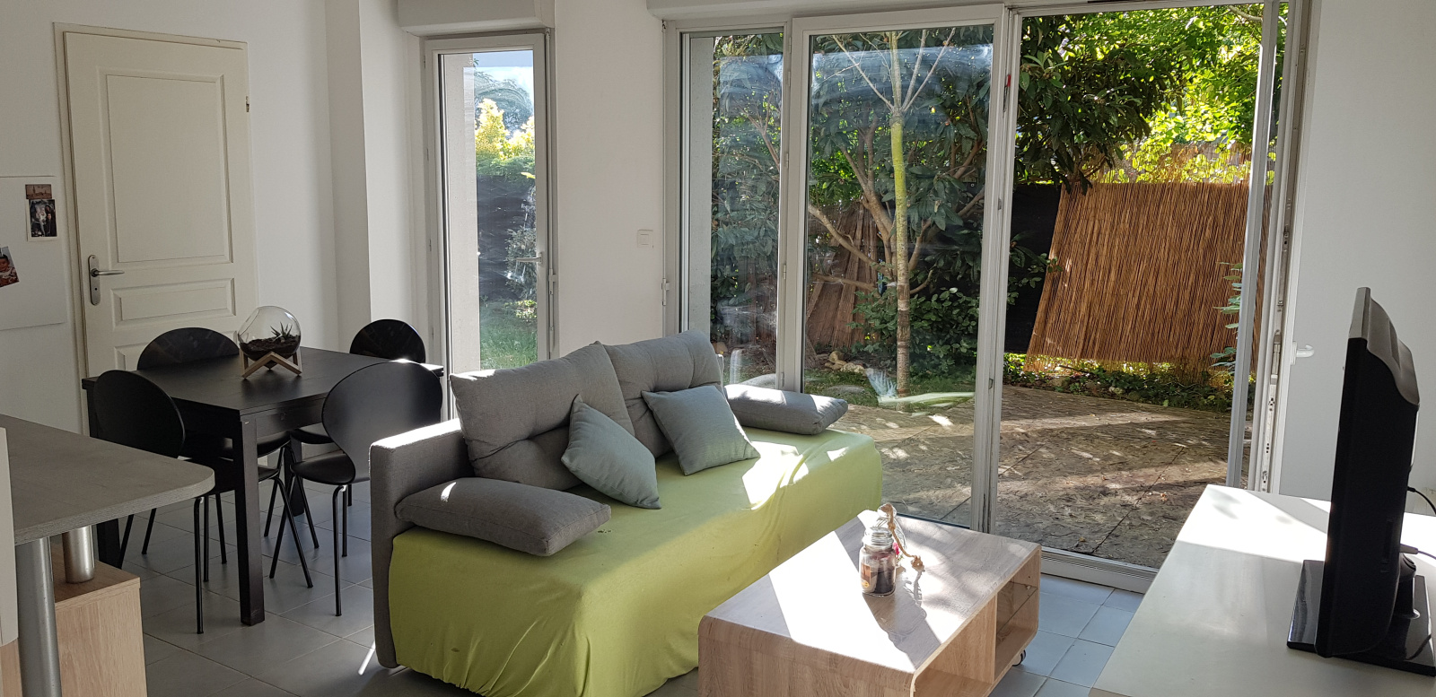 L’appartement se compose d’une entrée déservant un séjour avec une cuisine ouverte équipée de meuble haut, hotte, meuble bas, plaque deux feux vtitrocéramique, table top. Le tout donnant accès à un jardin cloturé (séjour/cuisine 24 m²) une chambre de 11m² avec un placard, une salle d’eau de 5 m², un WC séparé.