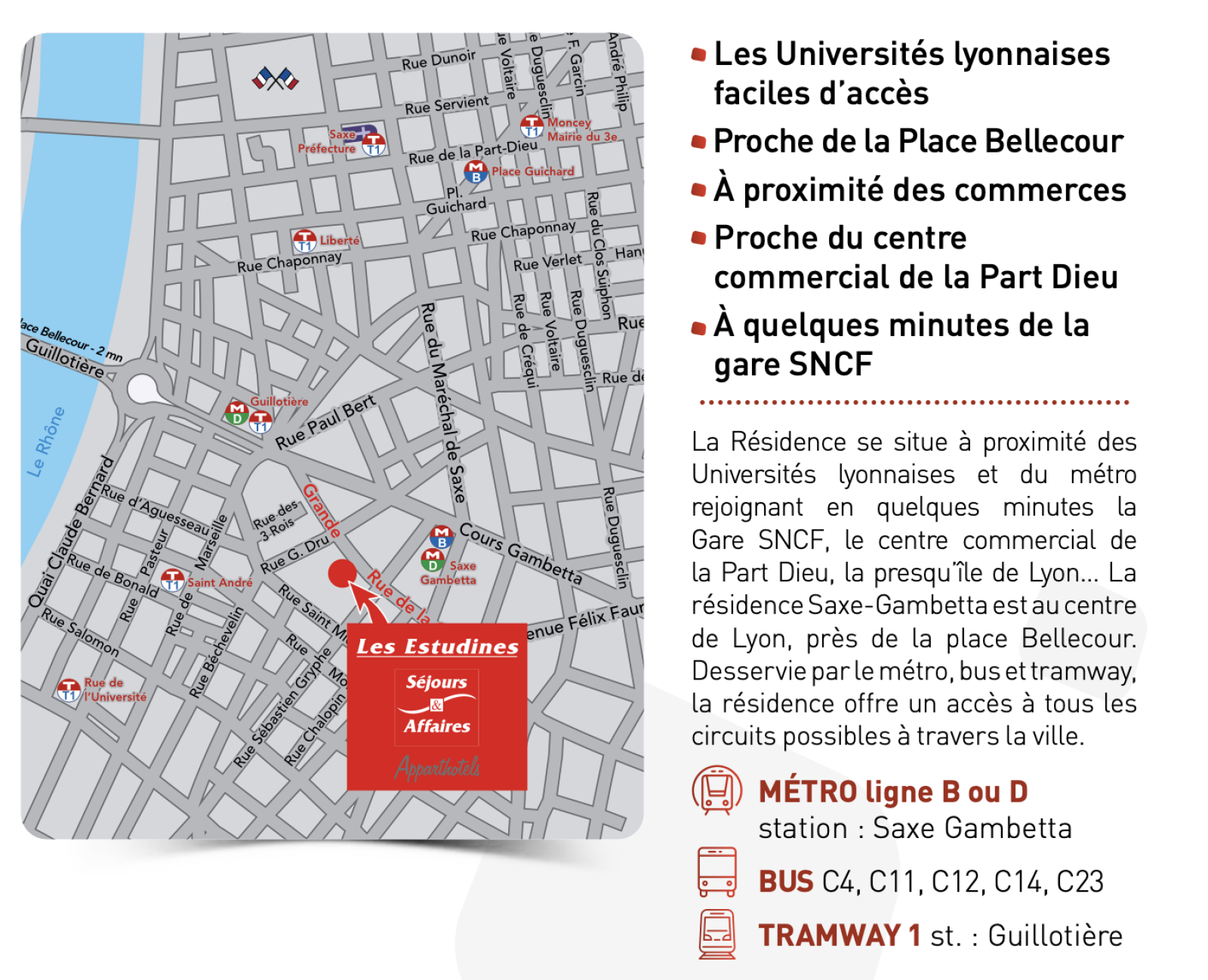 Grâce au métro D (arrêt « Gambetta ») situé à seulement 200 mètres à pied de la résidence, les étudiants peuvent rejoindre :