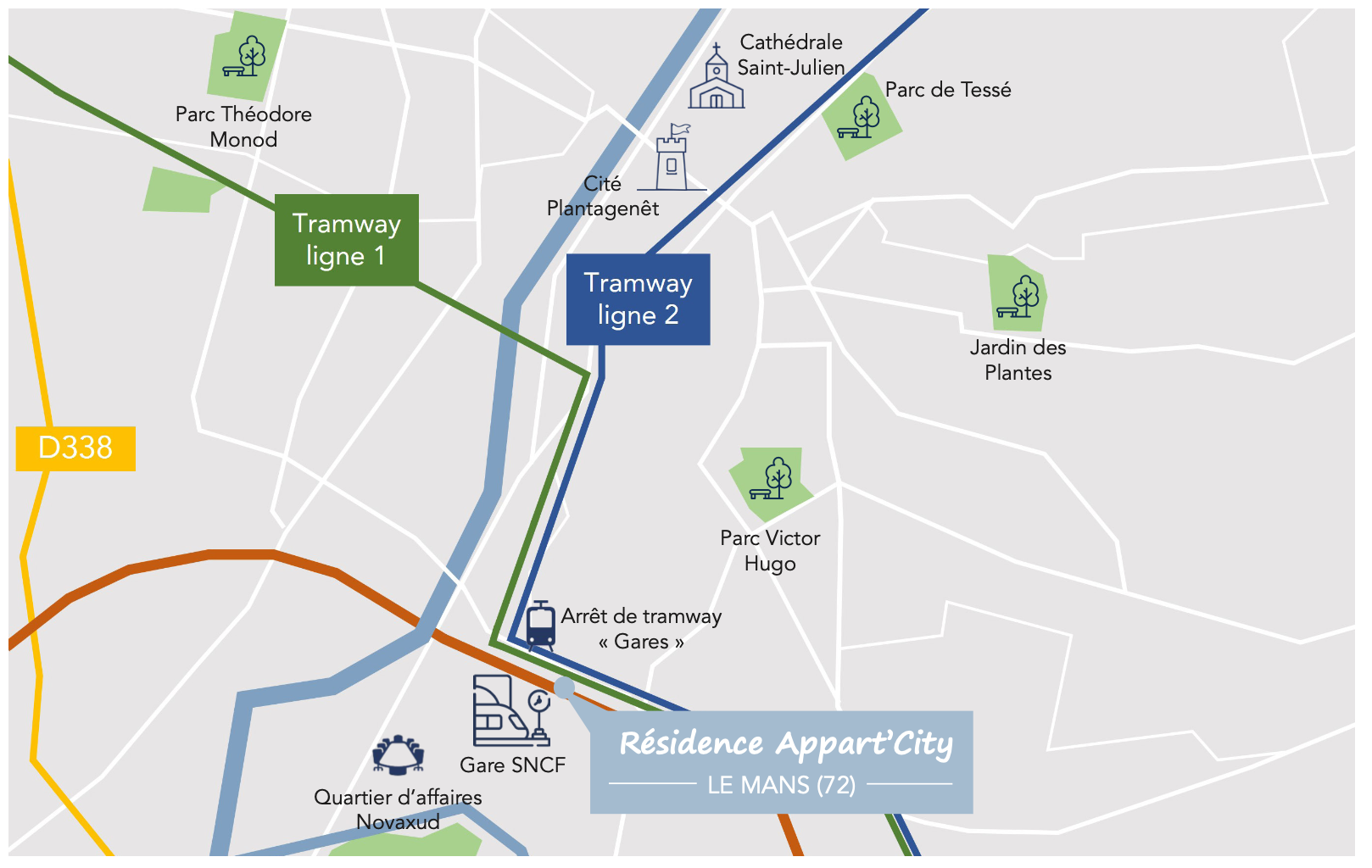 Construite en 2012, la résidence est située en périphérie du centre-ville, en face de la gare. Elle comporte 163 appartements répartis sur 5 niveaux, du studio de 18 m2 au T3 de 35 m2. Elle est notée 7,5 / 10 sur Booking.com.